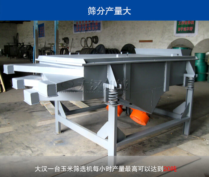 針對玉米篩選行業而言,對我們篩選機的產量是有要求的,大漢生產的玉米篩選機采用雙電機驅動,設備激振力大,而且我們的玉米篩選機加裝分料器,能有效的利用直線振動篩篩面面積,能使物料均勻分布在篩面上,大大提升物料篩分精度與蟬聯,據實驗證明,大漢一臺玉米篩選機每小時產量高可以達到20噸。