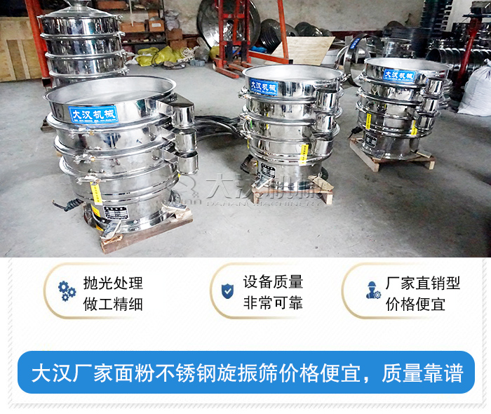 生產面粉不銹鋼旋振篩的廠家有很多,不同廠家對于設備價格是不同的,所以這里還是以本公司——大漢機械為例,大漢一臺面粉不銹鋼旋振篩價格在4000元——45000元之間。