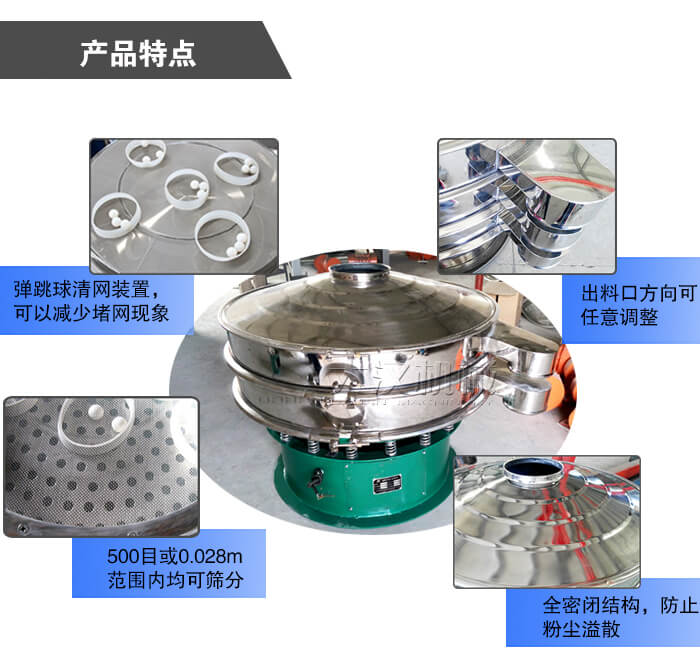 4、采用全密閉結構,防止粉塵溢散,液體飛濺,篩分效率高,還有專門的清網裝置,可減少物料在篩分的過程中的堵網現象,進一步提高其篩分效率;