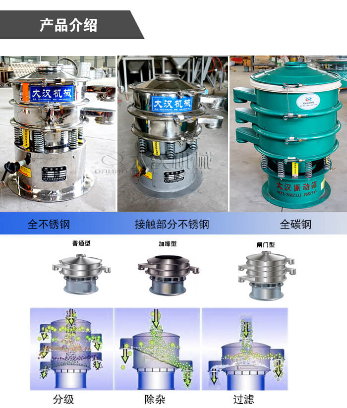 圓形旋振篩又叫圓形三次元旋振篩,主要由碳鋼、不銹鋼及全不銹鋼三種材質,大漢圓形旋振篩廠家直銷,型號多,關鍵是圓形旋振篩價格便宜,歡迎用戶來咨詢.
